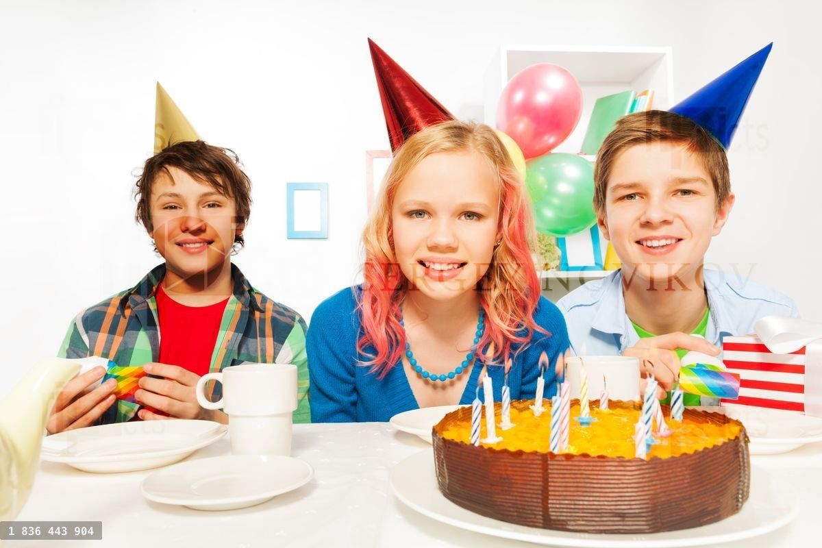 Three happy kids, young teens celebrating birthday party with cake candle and festive capsLoading purchase options...