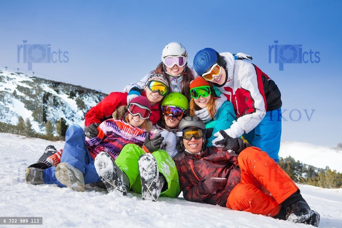 Group portrait of 7 cheerful friends (3 women and 4 men) wearing goggles holding each other in hug on the mountains backgroundLoading purchase options...