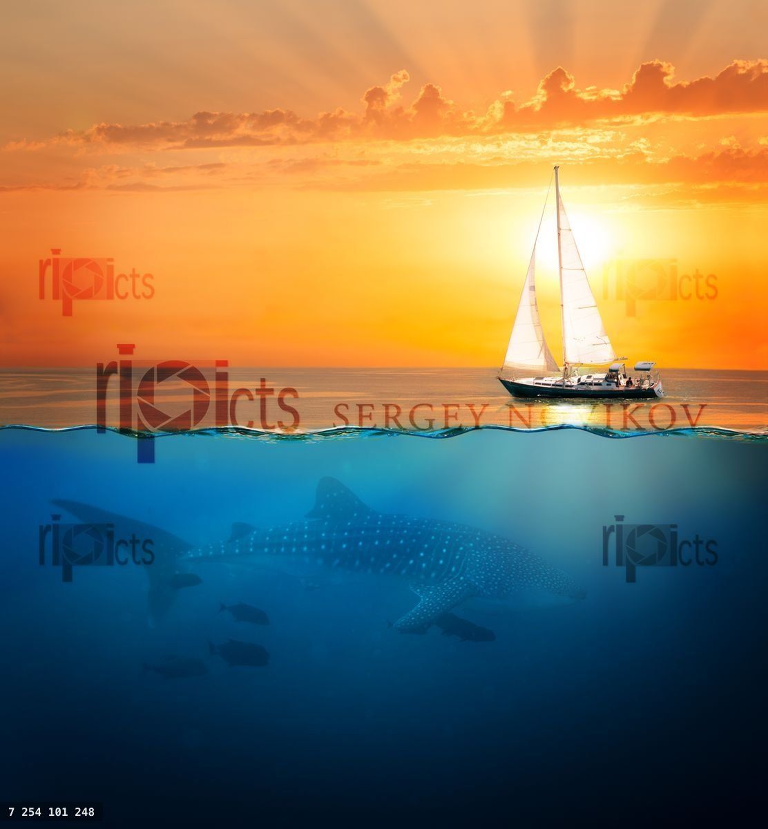 Half underwater shot with whale shark and yacht sailing at sunsetLoading purchase options...