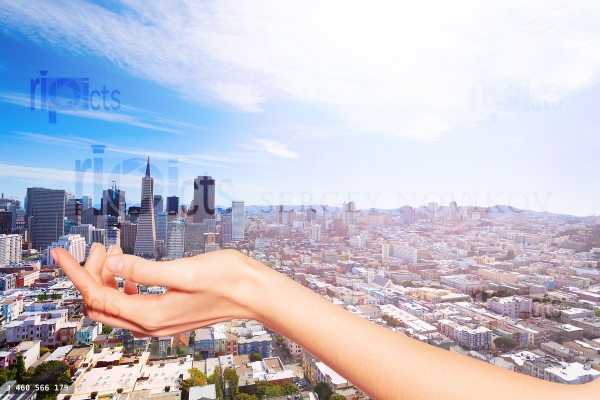 Optical illusion of female hand holding San Francisco Financial District in the palm, USALoading purchase options...