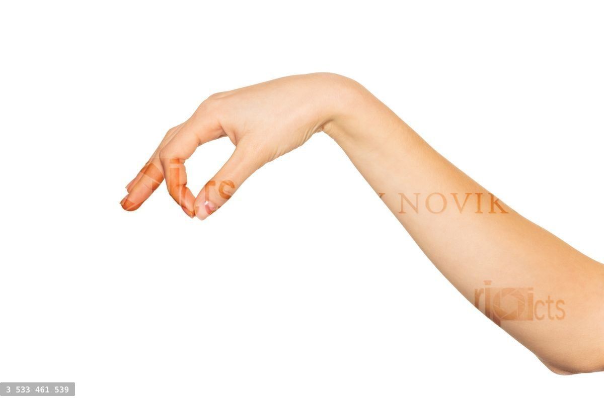 Empty woman's hand holding something between thumb and forefinger, isolated on whiteLoading purchase options...