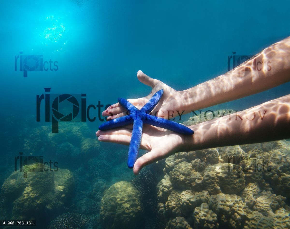 hands holding big blue starfish underwater with corals on backgroundLoading purchase options...