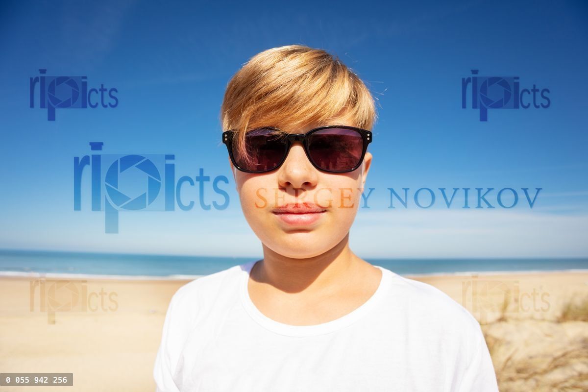 Close portrait of handsome boy in sunglasses on the beachLoading purchase options...