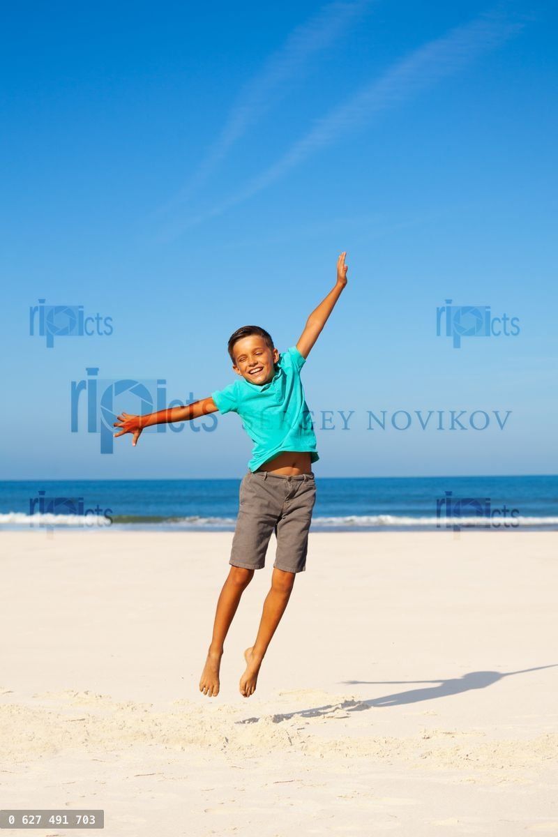 Handsome happy carefree boy jump on a sand beach lifting and spreading hands, over blue skyLoading purchase options...