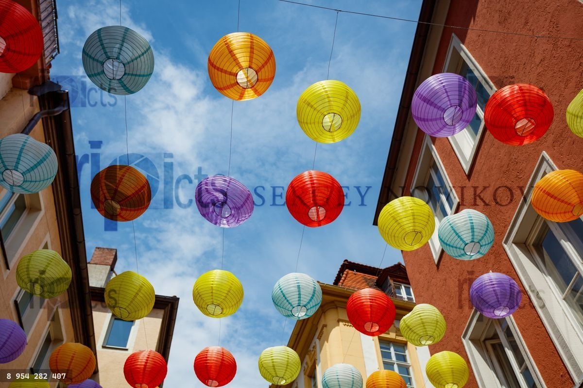 An alley decorated with colorful lanterns overhead bringing a cheerful vibe to the surrounding architecture, Wurzburg, Germany,Loading purchase options...