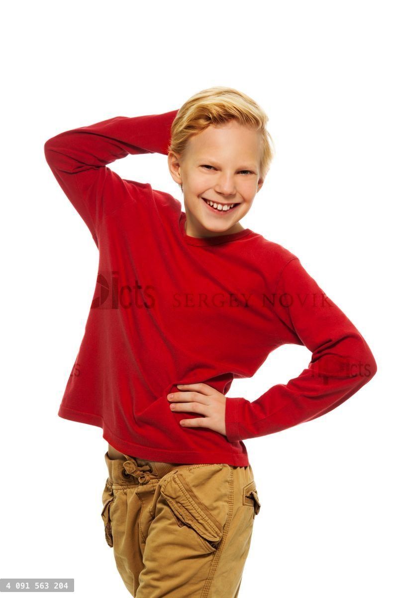 Happy 11 years old boy in red t-shirt on whiteLoading purchase options...
