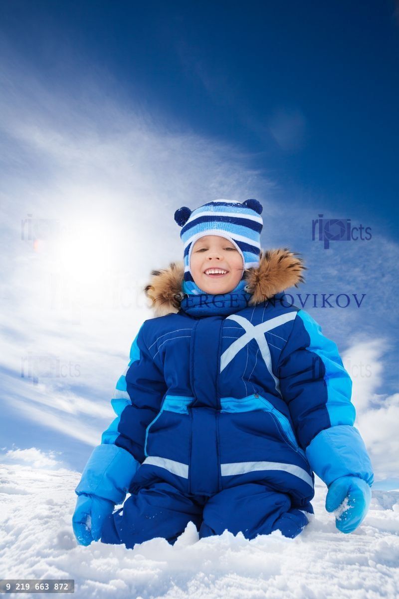 Happy 5 years old Caucasian boy sitting in snow outside in winterLoading purchase options...