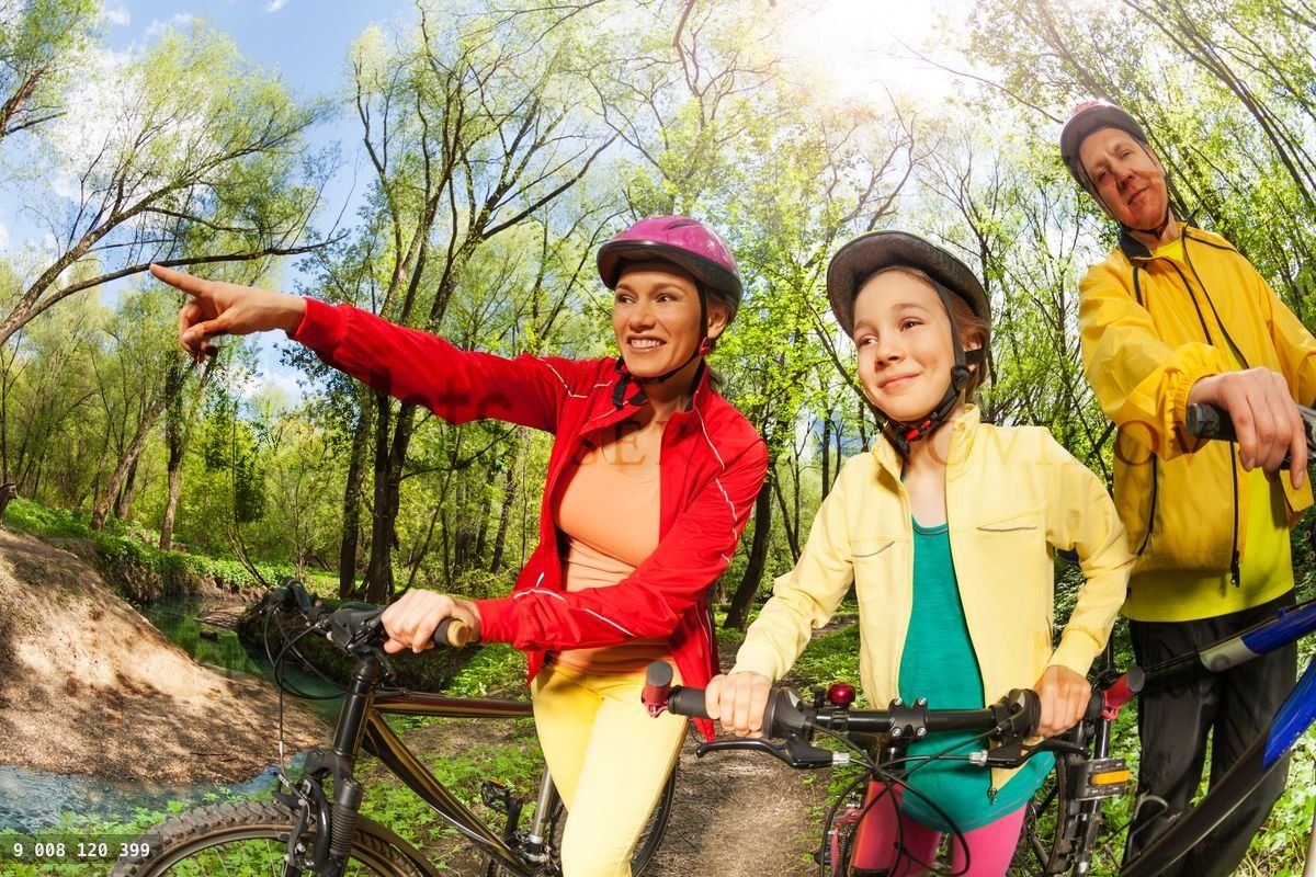 Portrait of happy active family with bikes finding their way in the spring wood, pointing with fingersLoading purchase options...