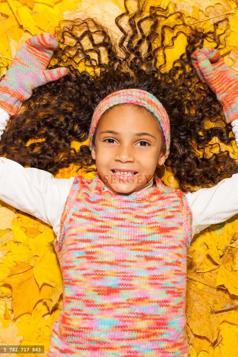 Happy African girl with black curly hair laying on the autumn orange leavesLoading purchase options...