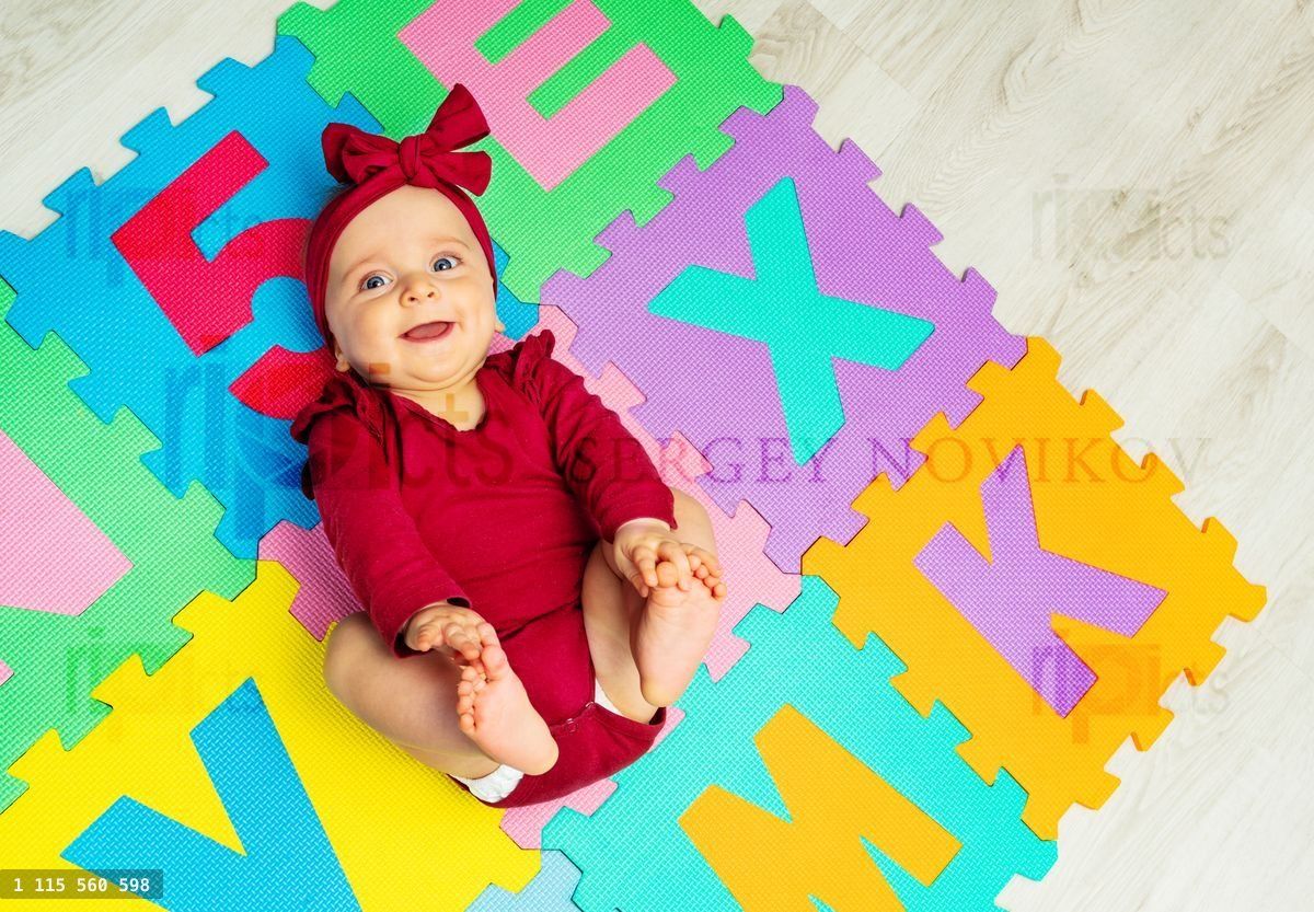 View from above of a little baby girl lay laughing on the color abc carpet with letters and numbersLoading purchase options...