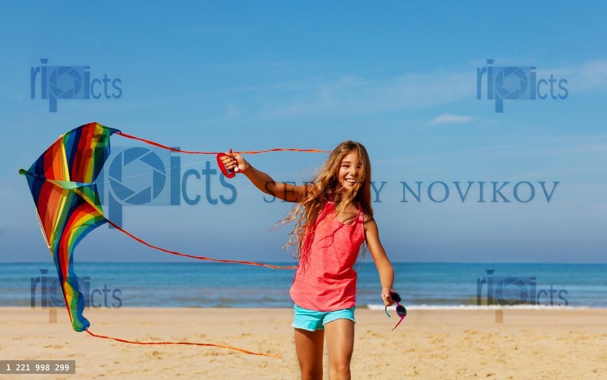 Portrait of a beautiful girl run and playing with colorful stripped kite on sea backgroundLoading purchase options...