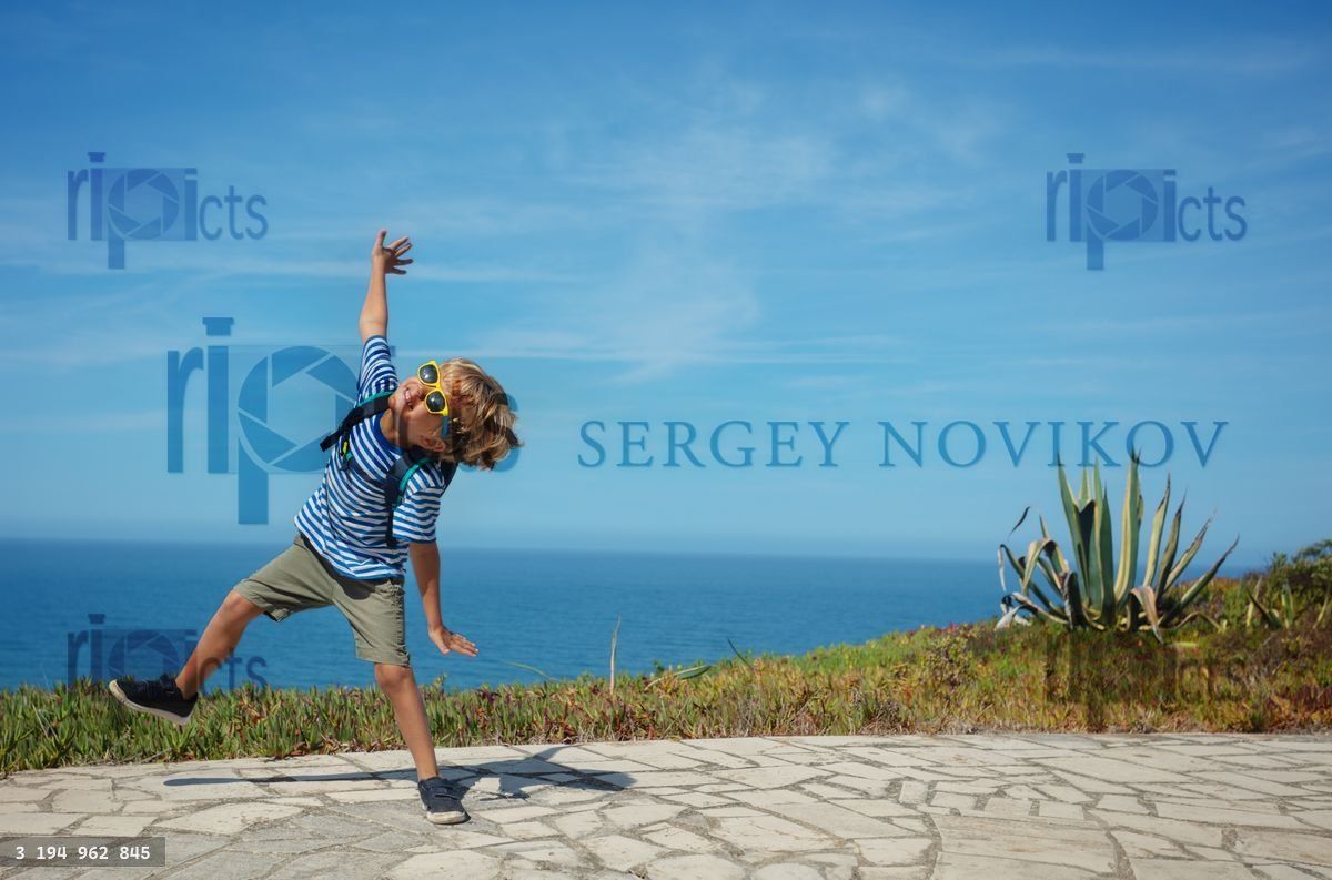 Happy blond boy in summer outfit with sunglasses dancing on sea background excited about vacations in PortugalLoading purchase options...