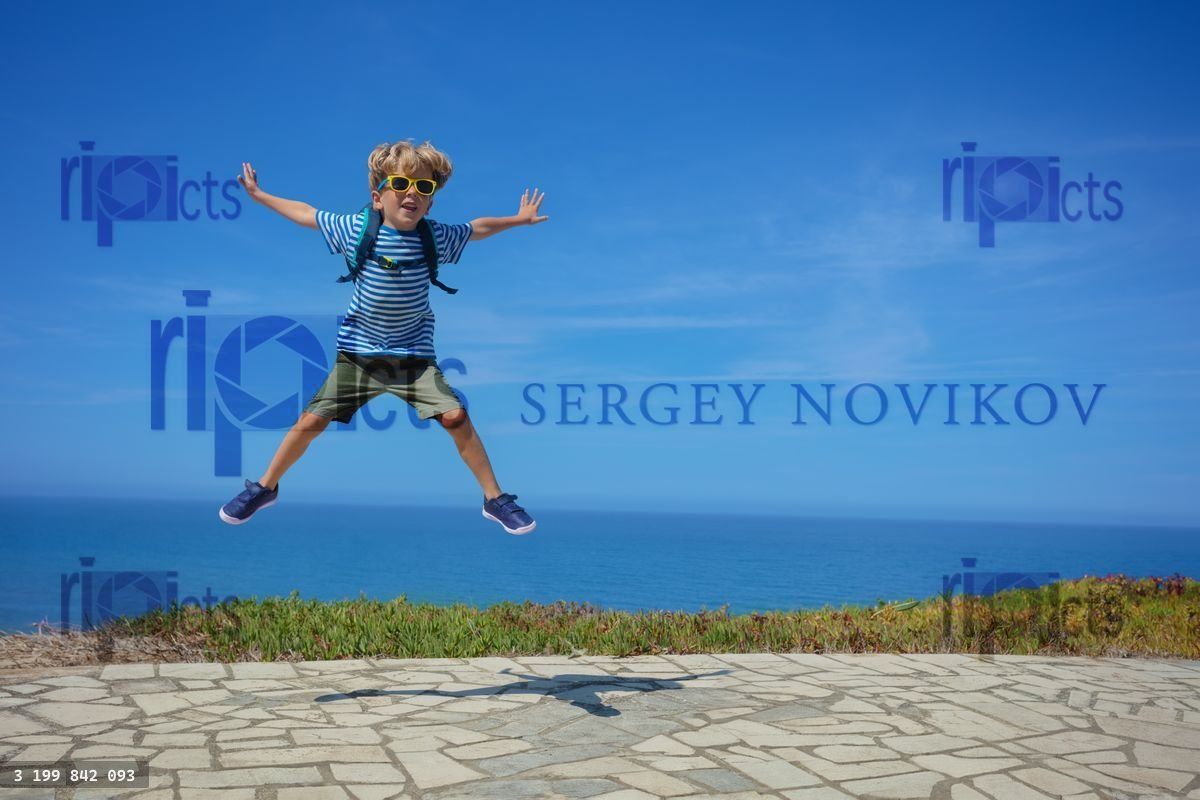Happy blond kid jump high on sea background wearing marine outfit and sunglasses, excited to see the oceanLoading purchase options...