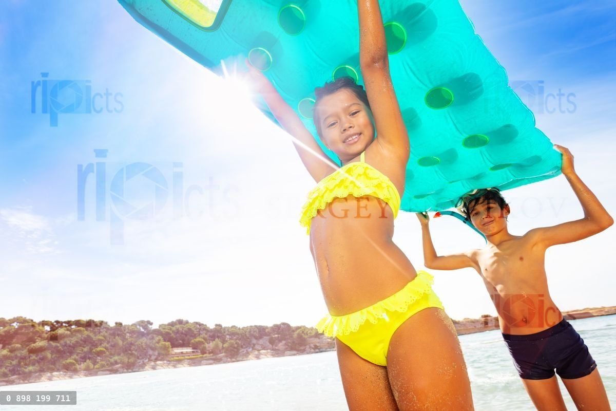 Low-angle shot of happy boy and girl standing on the beach, holding big swimming mattress overheadLoading purchase options...