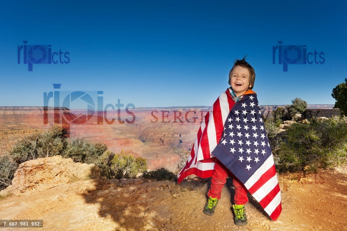 Happy small boy who is bundled up into American flag with Grand Canyon National Park view, USA on Independence DayLoading purchase options...