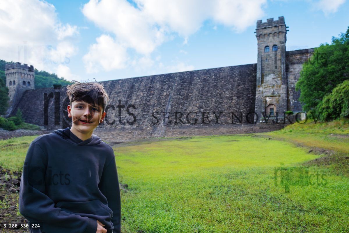A young teenage person stands smiling in front of a massive stone wall of Howden dam and lush greenery beneath a blue sky with fluffy clouds, EnglandLoading purchase options...