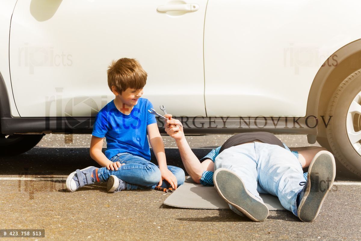 Caucasianmanadultfatherboysonkidkidschildchildrenfamilyhelphelperteachinglearningtogetherlifestyleoutdoorsfloorlyingundercarautotransportbrokenrepairfixmaintenancereplacementinspectionmechanictechnicianworkerworkjobtoolinstrumentequipmentwrenchspannerunderbodydowndiagnosticsinstallpartmasterfootlegsfixingroad