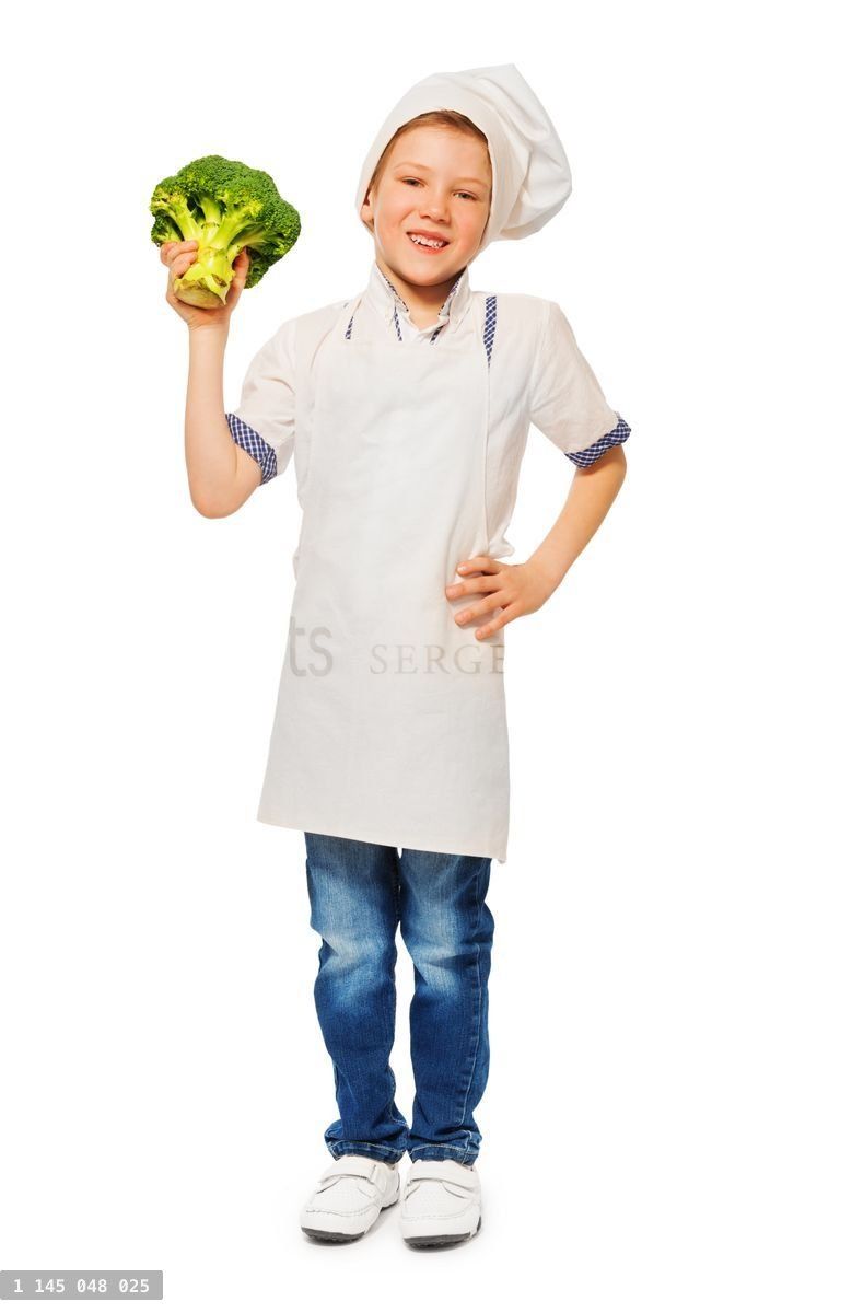 Full-length portrait of happy kid boy in cook's uniform holding fresh broccoli, isolated on whiteLoading purchase options...