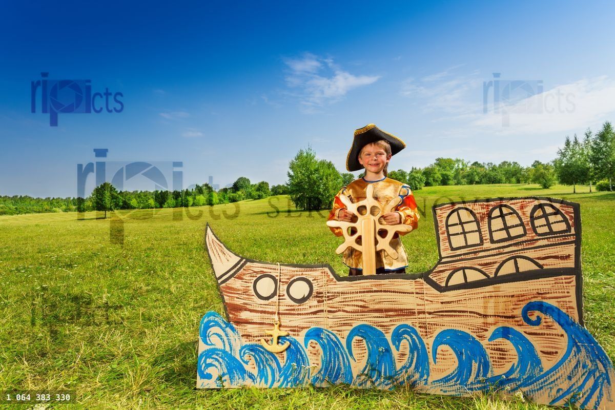 Happy boy in pirate costume holds the helm of theatric cardboard ship and looks straightLoading purchase options...