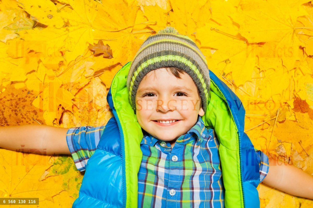 Close portrait of little young boy laying in the pale of leaves smiling, wearing hat and jacketLoading purchase options...