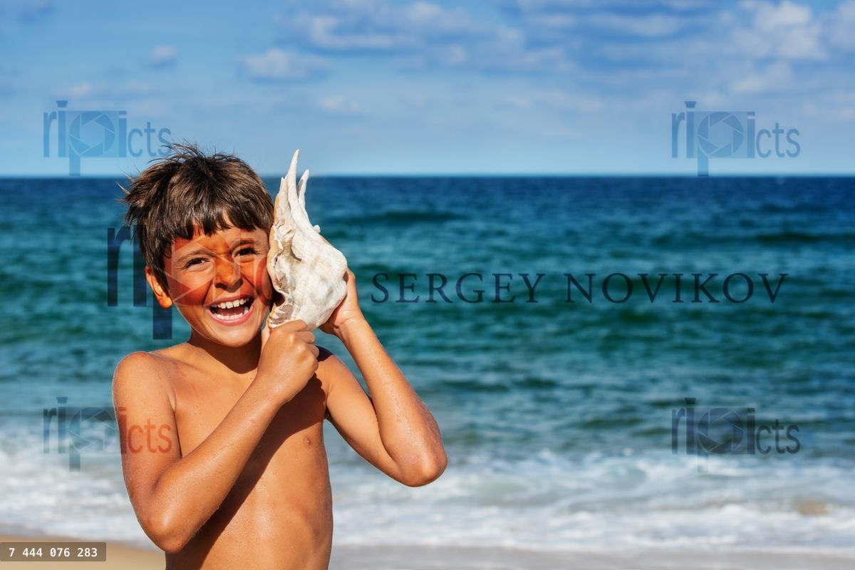 Portrait of a happy relaxed boy listen to huge seashell with big smile over sea backgroundLoading purchase options...