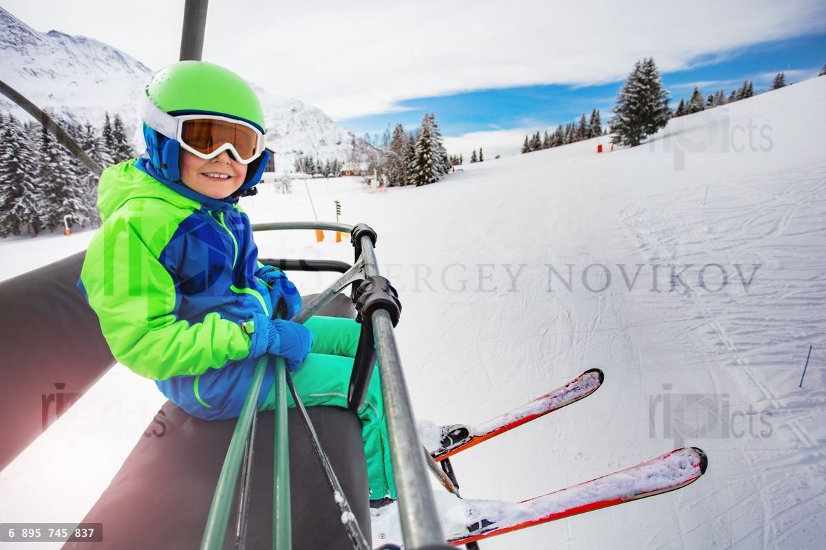 Little boy with ski clothes helmet and mask sit on the cable skilift chair smiling over mountains slope pisteLoading purchase options...