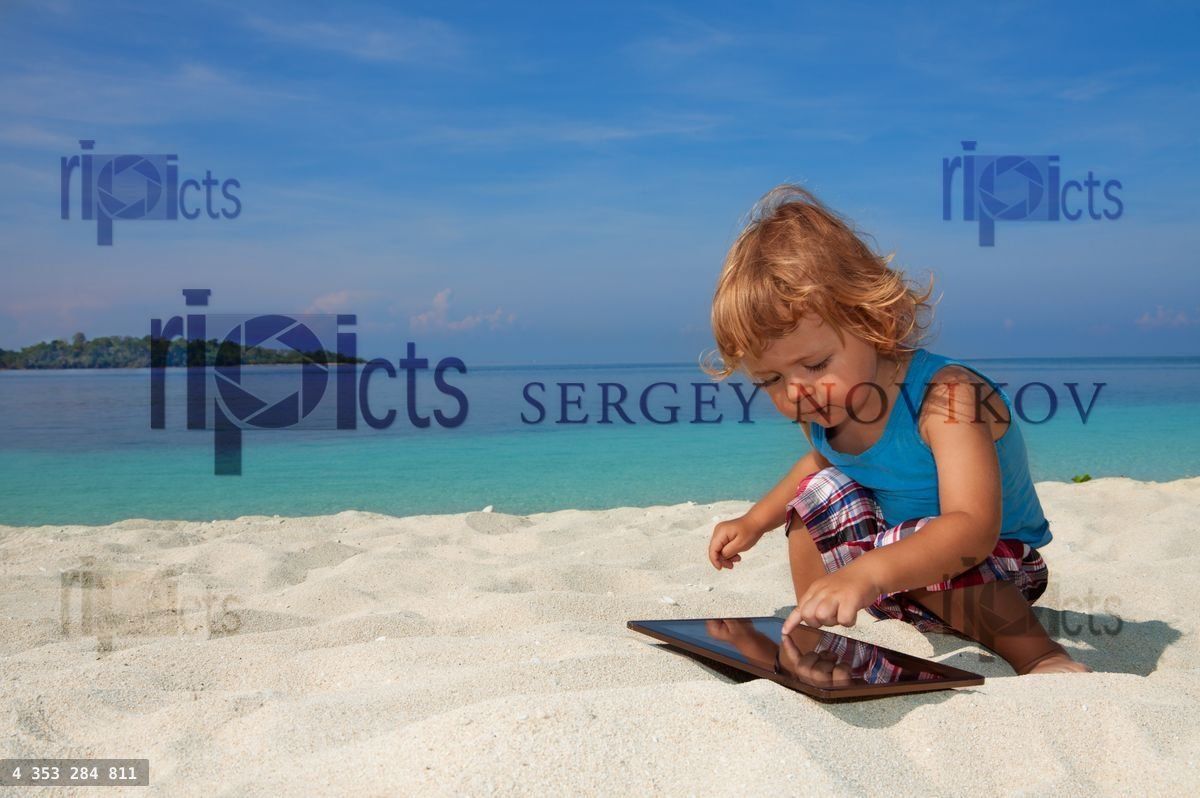 Happy kid on the beach playing tablet PCLoading purchase options...