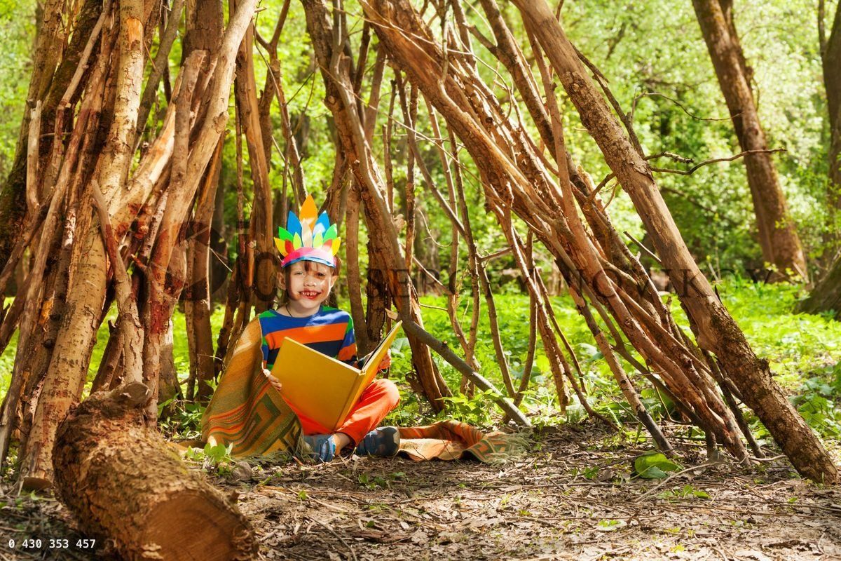 CaucasianpersonportraitboykidkidschildchildrenchildhoodlifestyleoutdooroutsidewoodenwoodforestparkstickbranchessummerplayhousetepeetenthuthovelwigwamredIndianredskinInjunAmericancostumeheaddressreadreadingbookblankedcopy-spaceplayplayinggamehappysmilingjoyadventurecamppretendingdisguisescoutsscoutfun