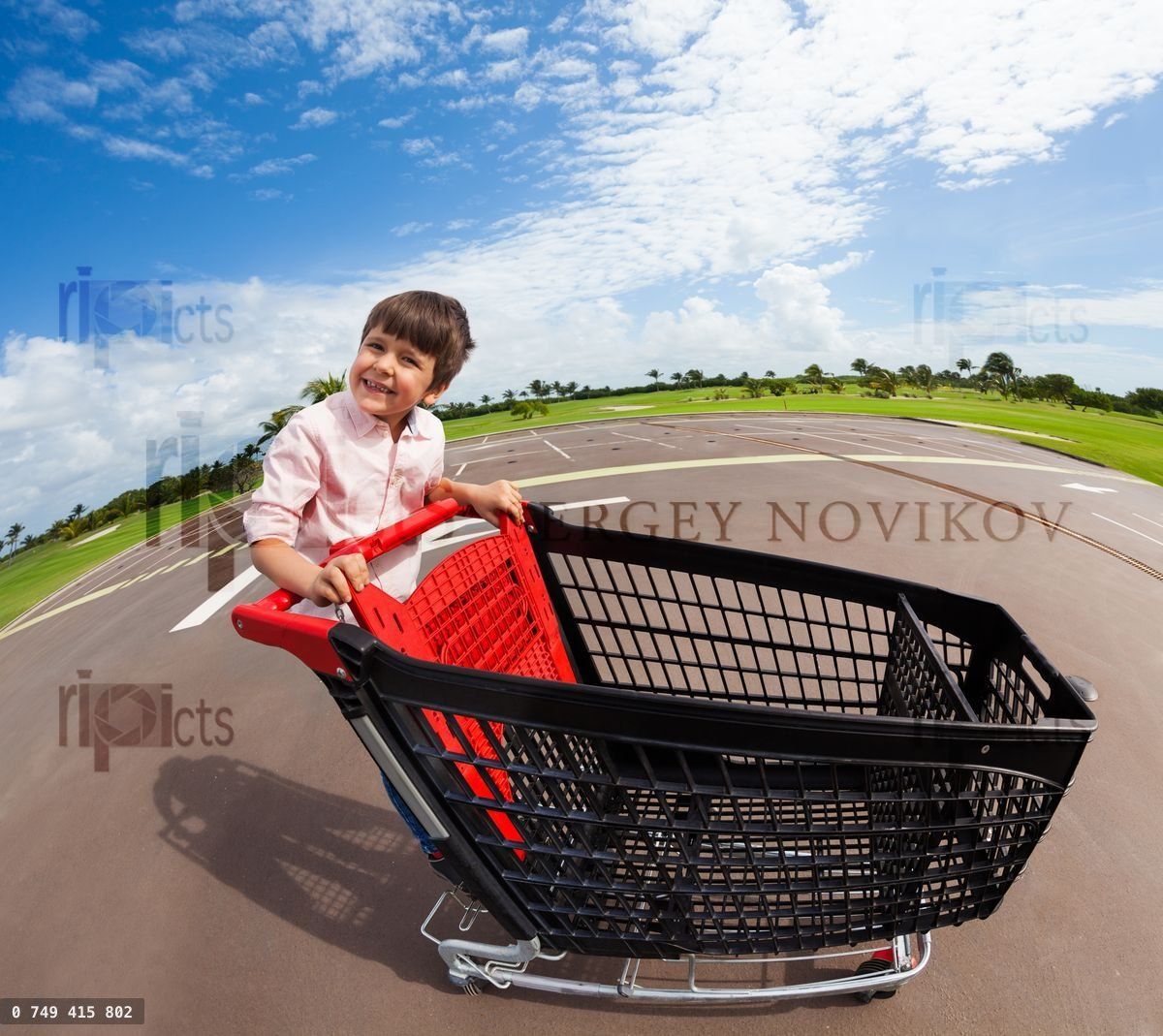 Fisheye picture of happy kid boy playing and riding empty supermarket shopping cart at parking lotLoading purchase options...