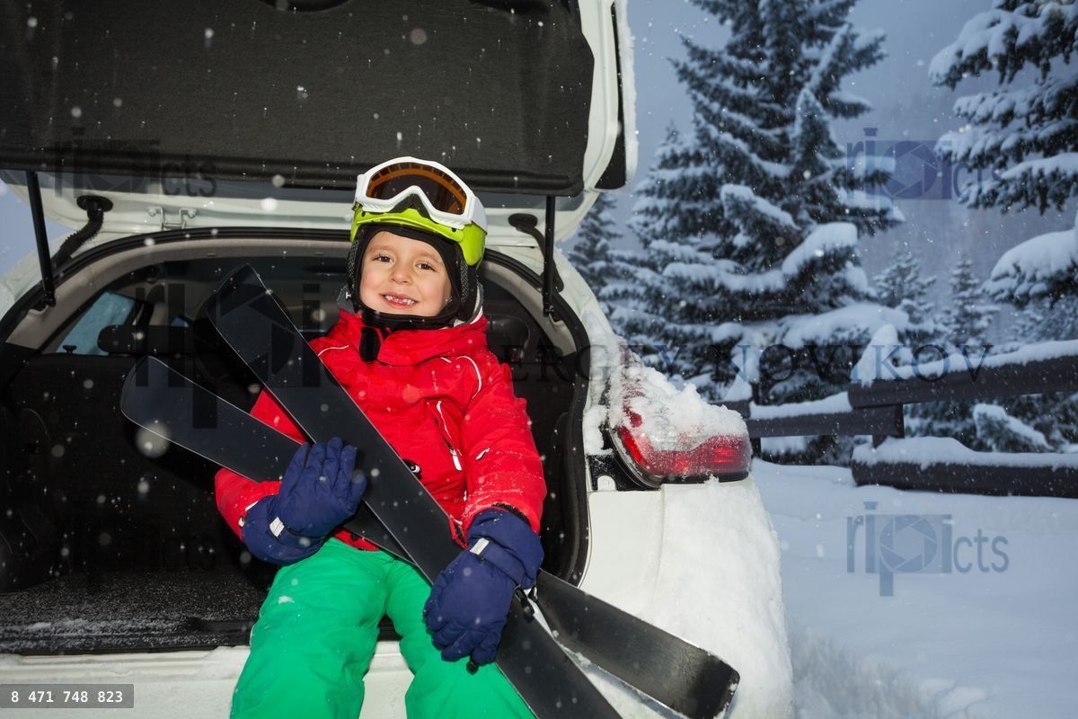 Happy boy in safety helmet and mask sitting in car trunk after ski trip in eveningLoading purchase options...