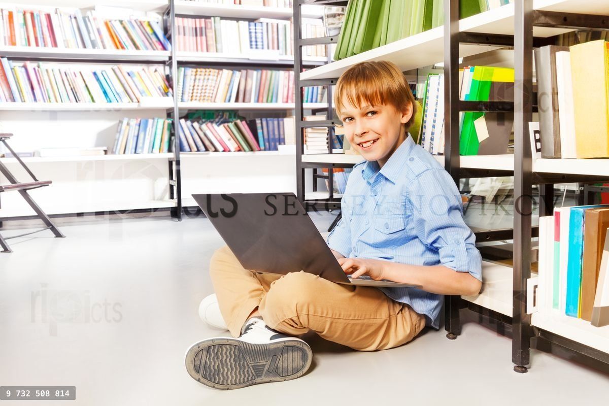 Happy boy sitting with laptop on the floor in libraryLoading purchase options...