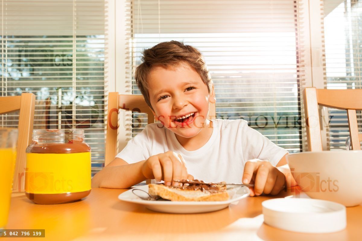 Caucasianboykidkidschildchildrenchildhoodlifestylesixyearsoldonepeoplepersonportraithappyhappinessjoyenjoyfunsmilesmilingbreakfastlunchmealfoodgoodmorningsunnytablekitchenplatesandwichspreadbreadchocolatebutternutknifeglassorangejuicetastyeateatingsittinghungryblankedcopy-spacesunlight