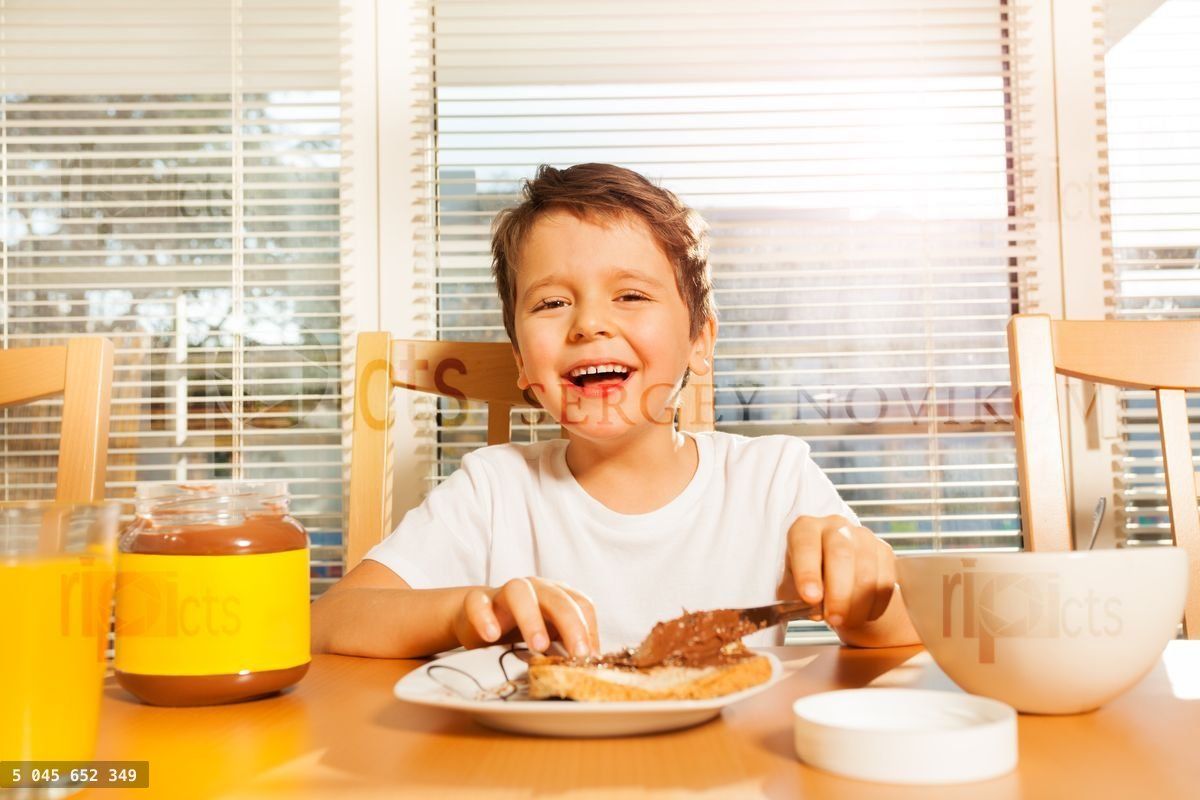 Caucasianboykidkidschildchildrenchildhoodlifestylesixyearsoldonepeoplepersonportraithappyhappinessjoyenjoyfunsmilesmilingbreakfastlunchmealfoodgoodmorningsunnytablekitchenplatesandwichspreadbreadchocolatebutternutknifeglassorangejuicetastyeateatingsittinghungryblankedcopy-spacesunlight
