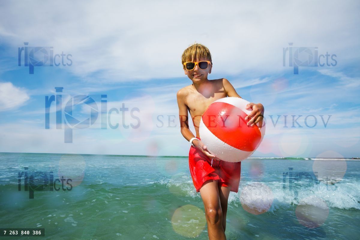 Cute boy stand in orange sunglasses in sea with inflatable color ball view from side during summer beach vacationLoading purchase options...