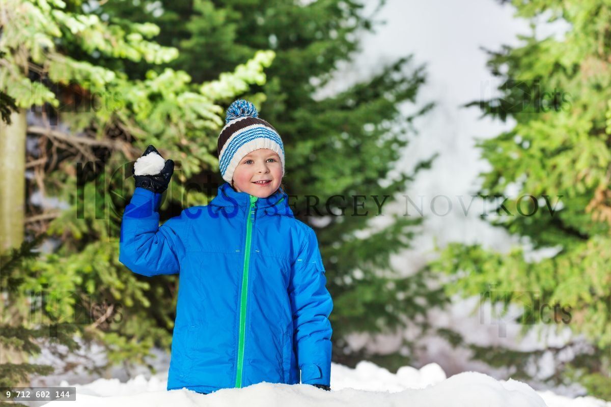 Handsome little boy in blue coat throw snow standing in parkLoading purchase options...