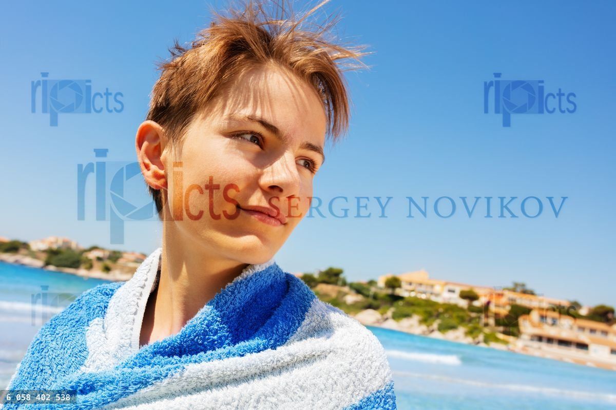 Close-up portrait of teenage blond boy wrapped in beach towel looking seawardLoading purchase options...