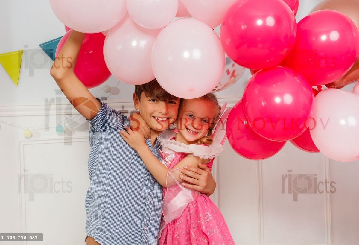 Happy brother and sister with balloons hugging at birthday party