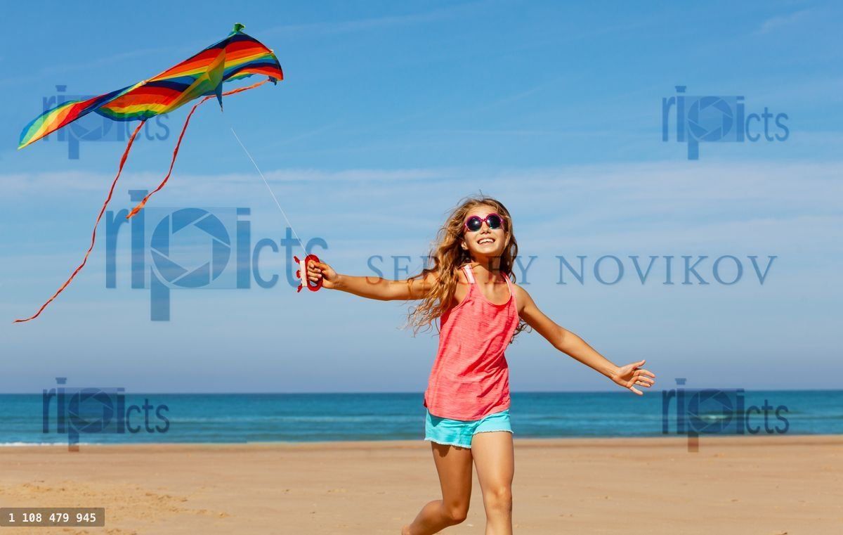 Happy carefree girl run with kite on a sand beach
