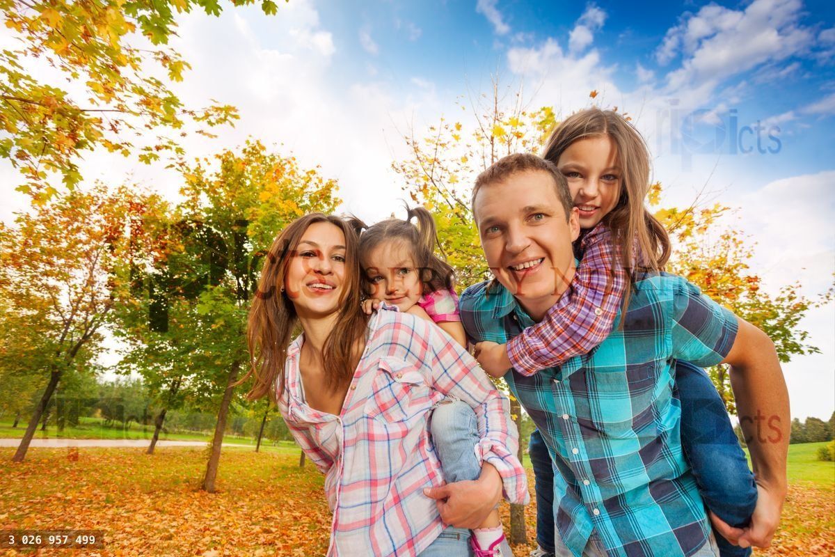 Happy family mother and father carry little girls in the autumn parkLoading purchase options...