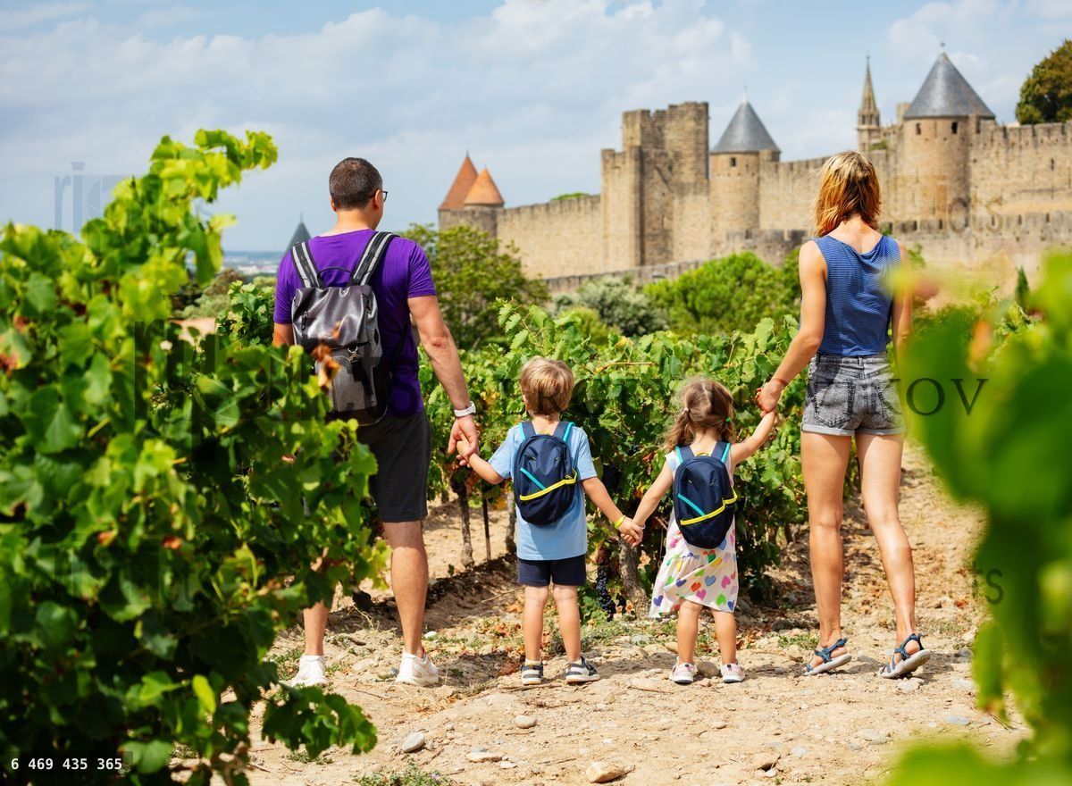 ecotourismsisterbrothersiblingdadmomfathermotheragriculturefamilykidstouriststravelCarcassonnevineyardsummerchildrentourismFrancemedievalfortresssightseeingjourneyvacationhistoryheritageexcursionhistoricaltowersFrenchsiblingsholidaysSouthcitybarbicanswallsEuropeanEuropevisitinghistorictripboygirlfunOccitaniachildbackbehindvacationsgrapes