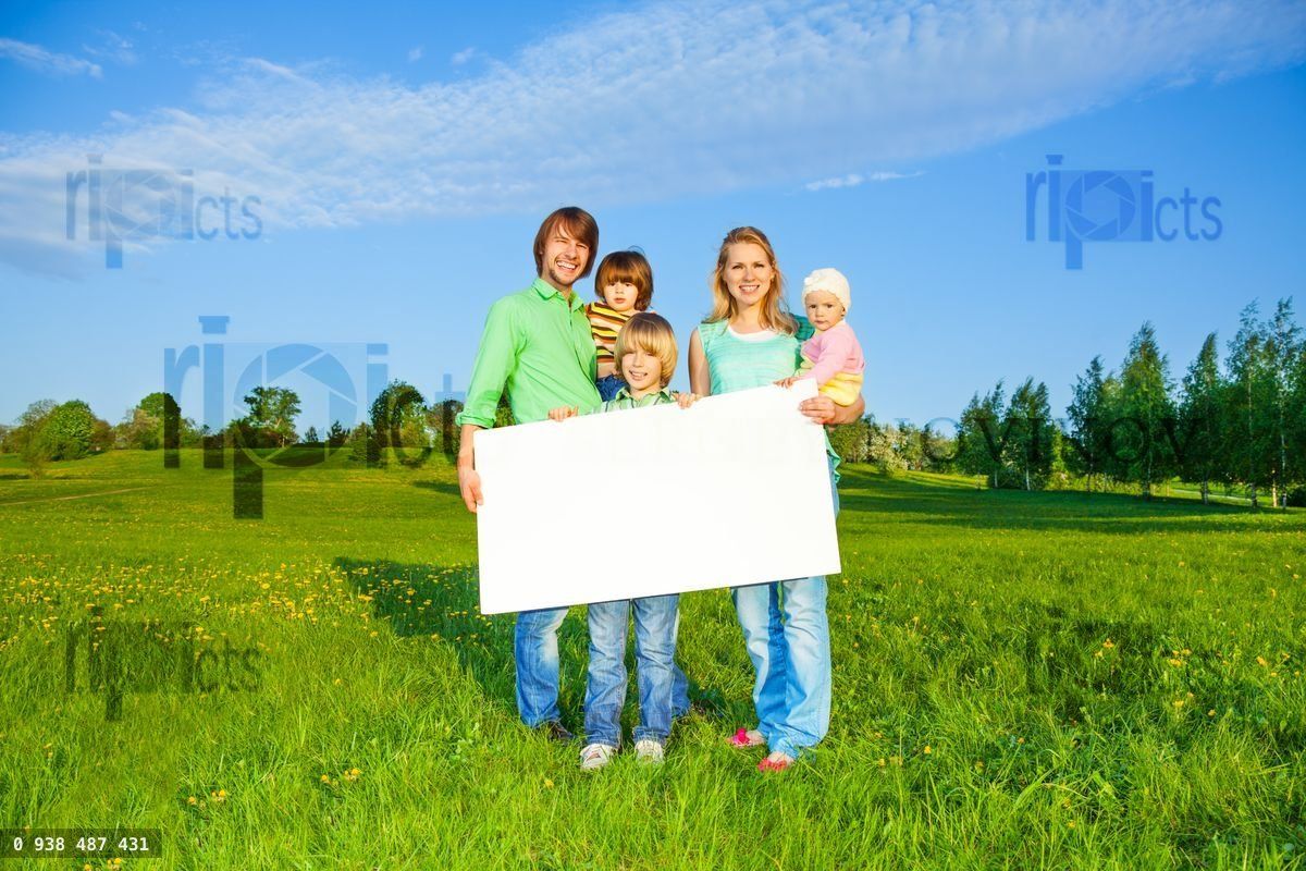 Happy family holds white square paper format in park in summerLoading purchase options...