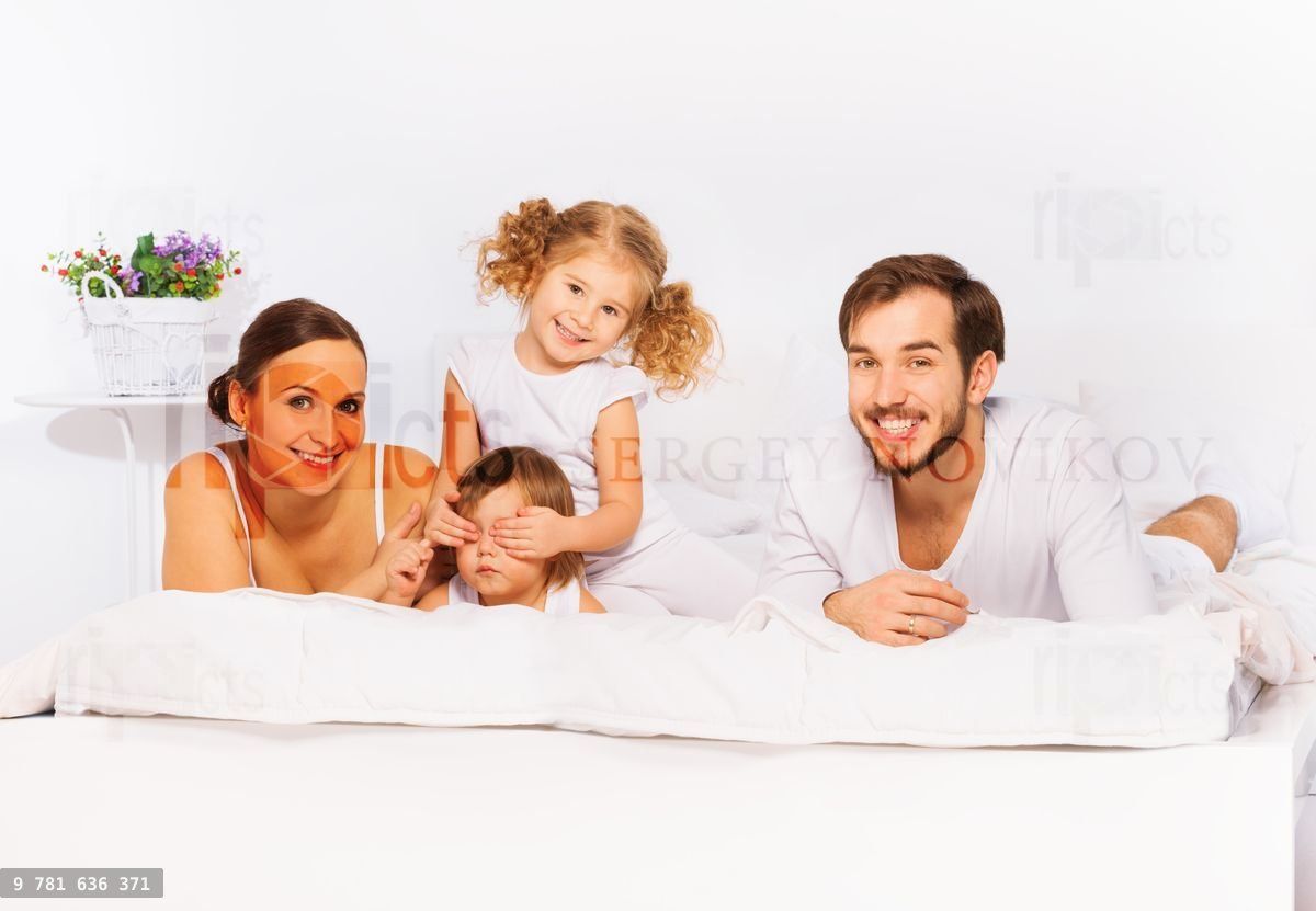 Happy family laying on white bed in white pajamas together in the morningLoading purchase options...