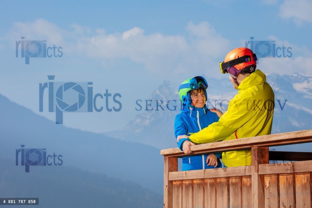 Happy ski family on chalet balcony admiring Alps in helmet and mask overlooking mountainsLoading purchase options...