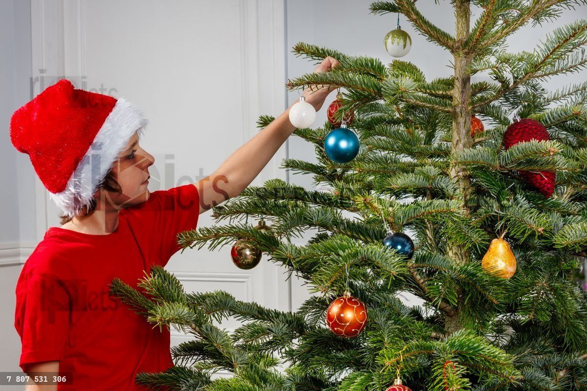 A young boy in festive clothes, including a Santa hat, is seen decorating a Christmas tree with colorful baublesLoading purchase options...