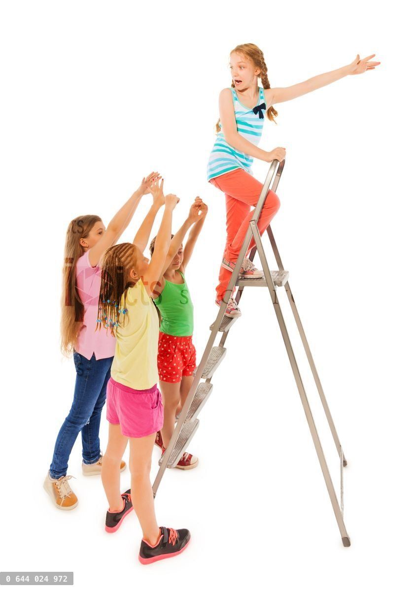 Kids chasing funny girl climbing up the ladder isolated on whiteLoading purchase options...