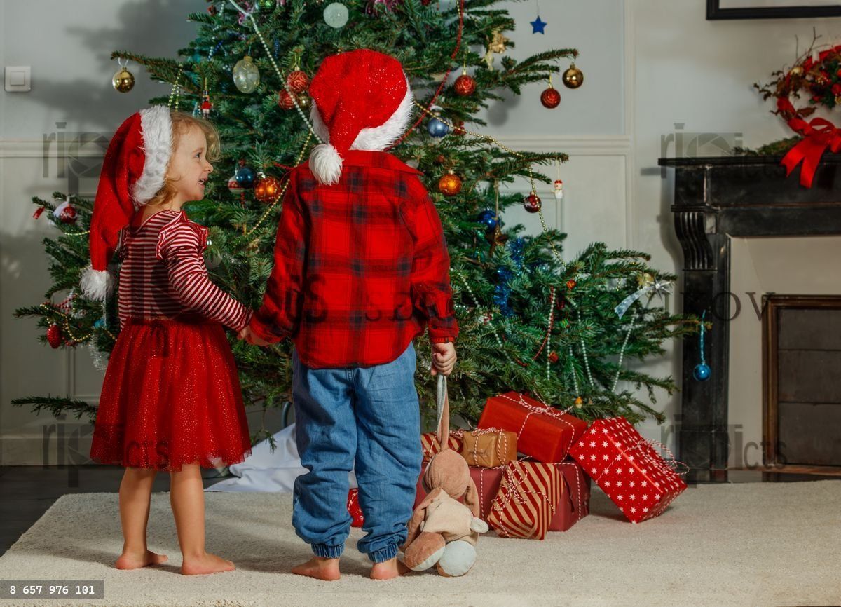A boy and a girl, both donning festive Santa Claus hats, are standing on a carpet near a decorated Christmas tree, with neatly wrapped presents underneathLoading purchase options...