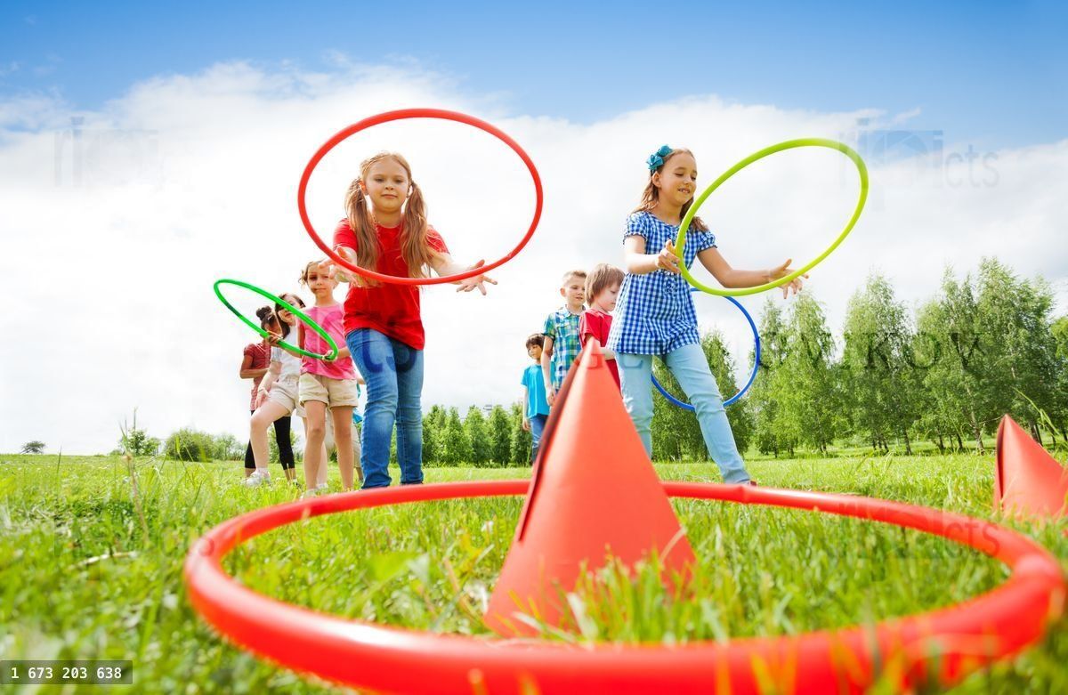 Two group of kids playing with colorful hoops and throw them on cones while competing with each other during summer sunny dayLoading purchase options...