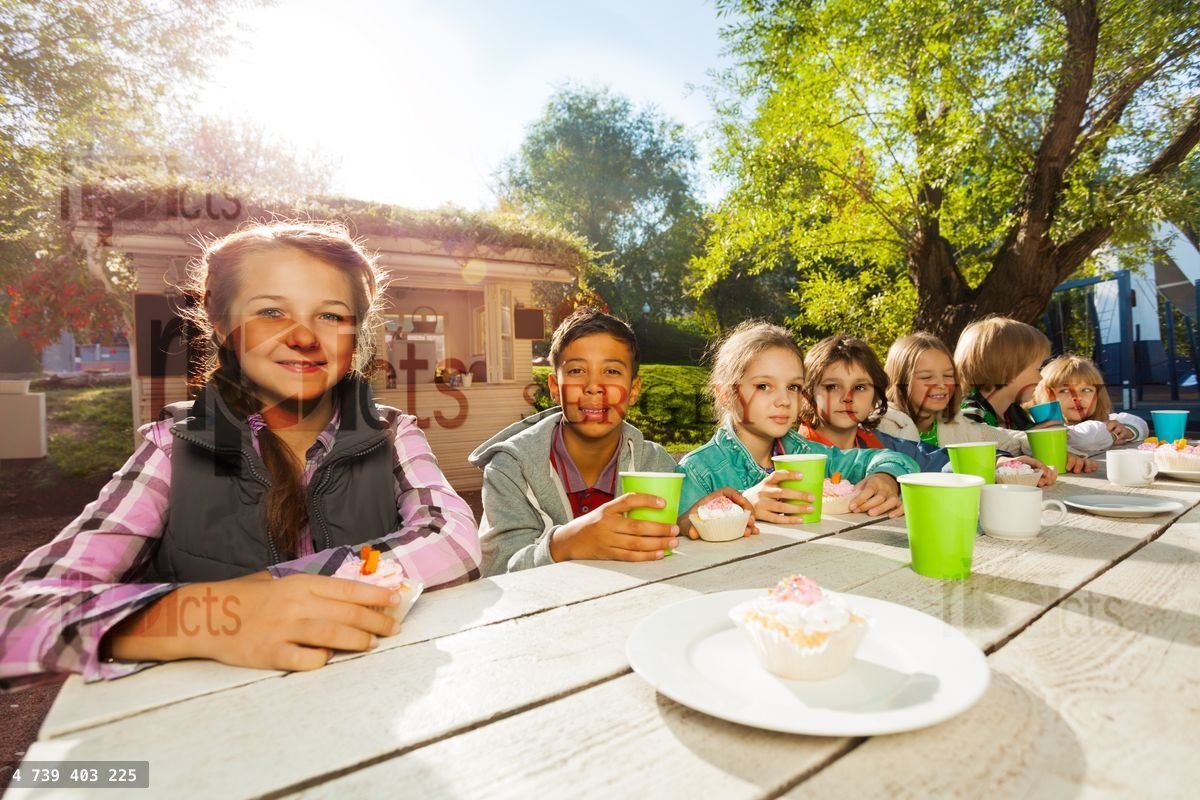 Many children sit at wooden white table with colorful bright cups and tasty cupcakes during sunny autumn day with trees on backgroundLoading purchase options...