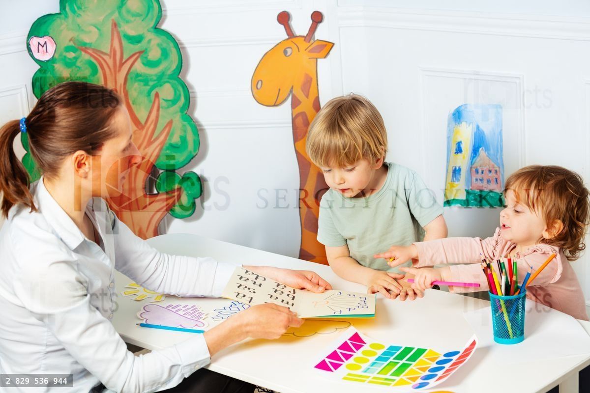 Woman in the kindergarten teach children boy and girl to read letters in early development class view from aboveLoading purchase options...