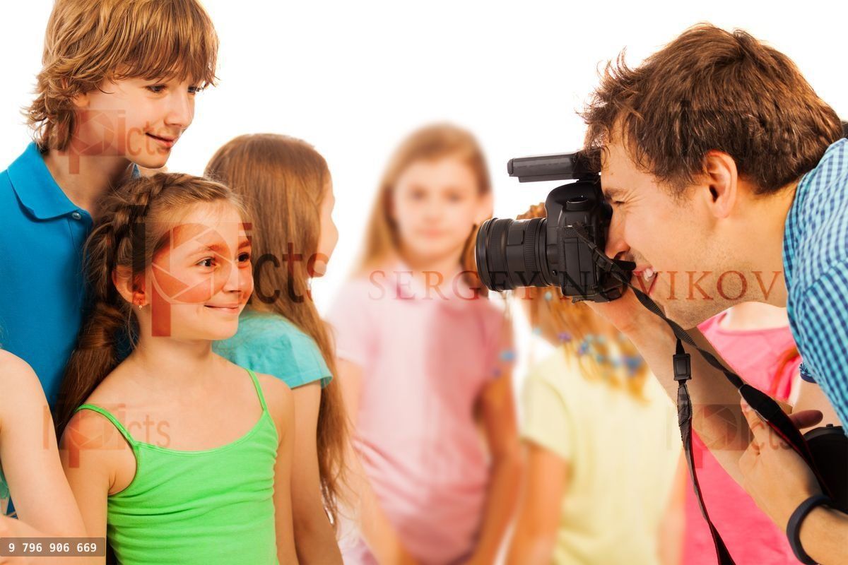 Adult photographer photographing beautiful kids boys and girls with dslr cameraLoading purchase options...